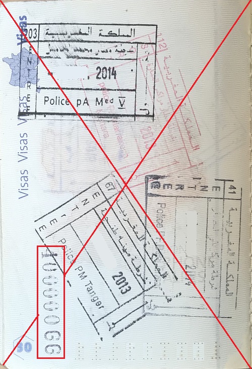 Pour le Maroc, un numéro identifiant (5 chiffres et 2 lettres) est apposé sur le passeport en complément du cachet d'entrée. Par la suite, il est réutilisé lors de chaque entrée dans le pays et est notamment nécessaire pour remplir le formulaire 16 TER d'importation temporaire d'un véhicule. |