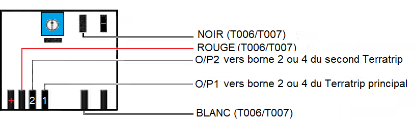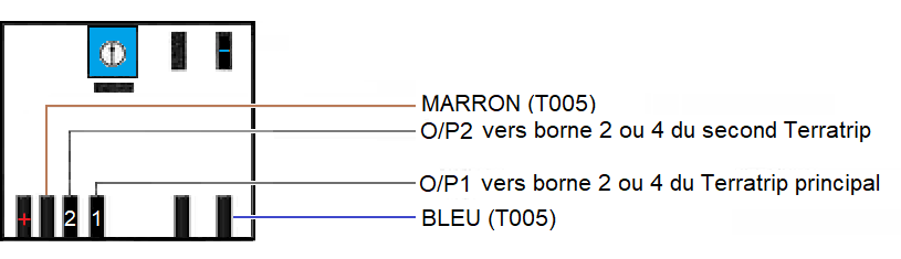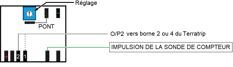 Ce branchement permet de convertir le signal d'une sonde électronique de compteur 3 fils vers le Terratrip. Signal vu par Probe 1 : vers borne 2 Terratrip. Signal vu par Probe 2 : vers borne 4 Terratrip. En cas de mauvais fonctionnement, utiliser la sortie O/P1. |