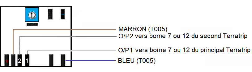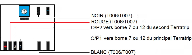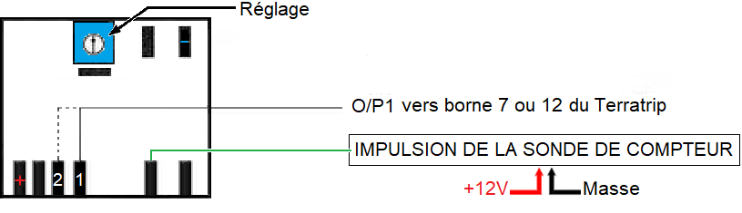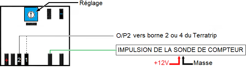 Ce branchement permet de convertir le signal d'une sonde électronique de compteur 3fils vers le Terratrip. Signal vu par Probe 1 : vers borne 7 Terratrip. Signal vu par Probe 2 : vers borne 12 Terratrip. En cas de mauvais fonctionnement, utiliser la sortie O/P2. |