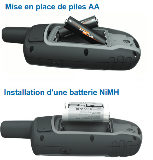 La série GPSMAP 65 peut recevoir 2 piles type AA ou une batteries NimH pouvant être chargée par le port mini-USB en roulant.
