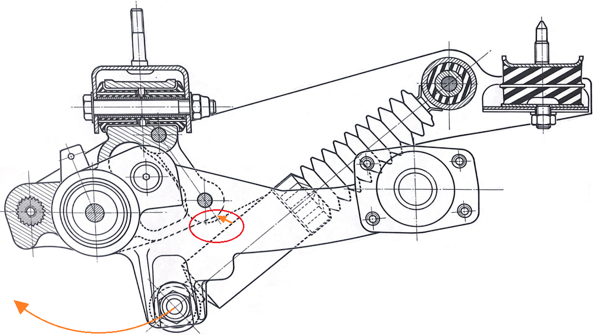 Attention, si le train est d'origine, la rehausse de la caisse au maximum peut engendrer une interférence entre le corps d'amortisseur et les fixations inférieures de traverse du fait de la cinématique de mouvement du bras de suspension.