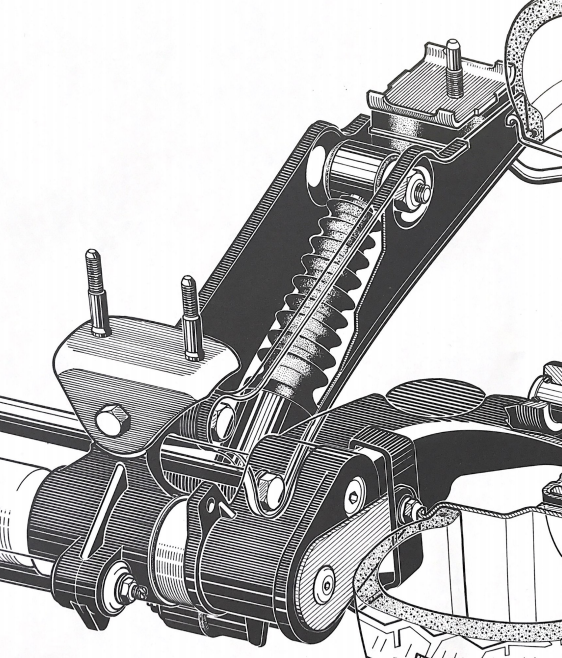 L'amortisseur se rapproche de la traverse au fur et à mesure que le bras descends →