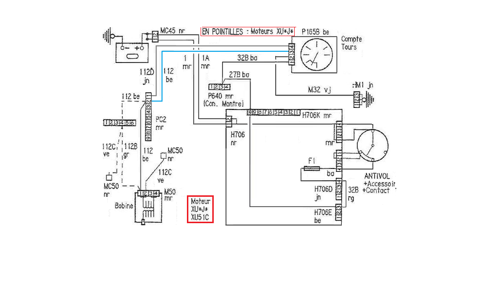 A noter que les 205 phase 1 (avant 88) pouvait être équipé d'un compteur "classique" Jeager avec un compte tours. Le fil 112 d'allumage se branche sur la borne 8 de la prise P165B blanche : |