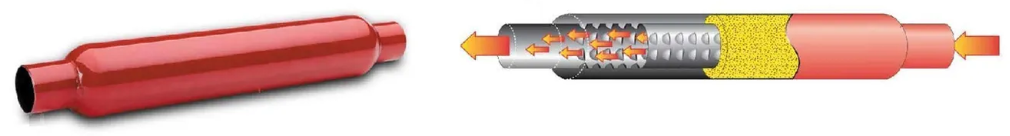 Le tube interieur percé d'une multiple trous est entouré de laine de verre haute température pour l'absortion du bruit.