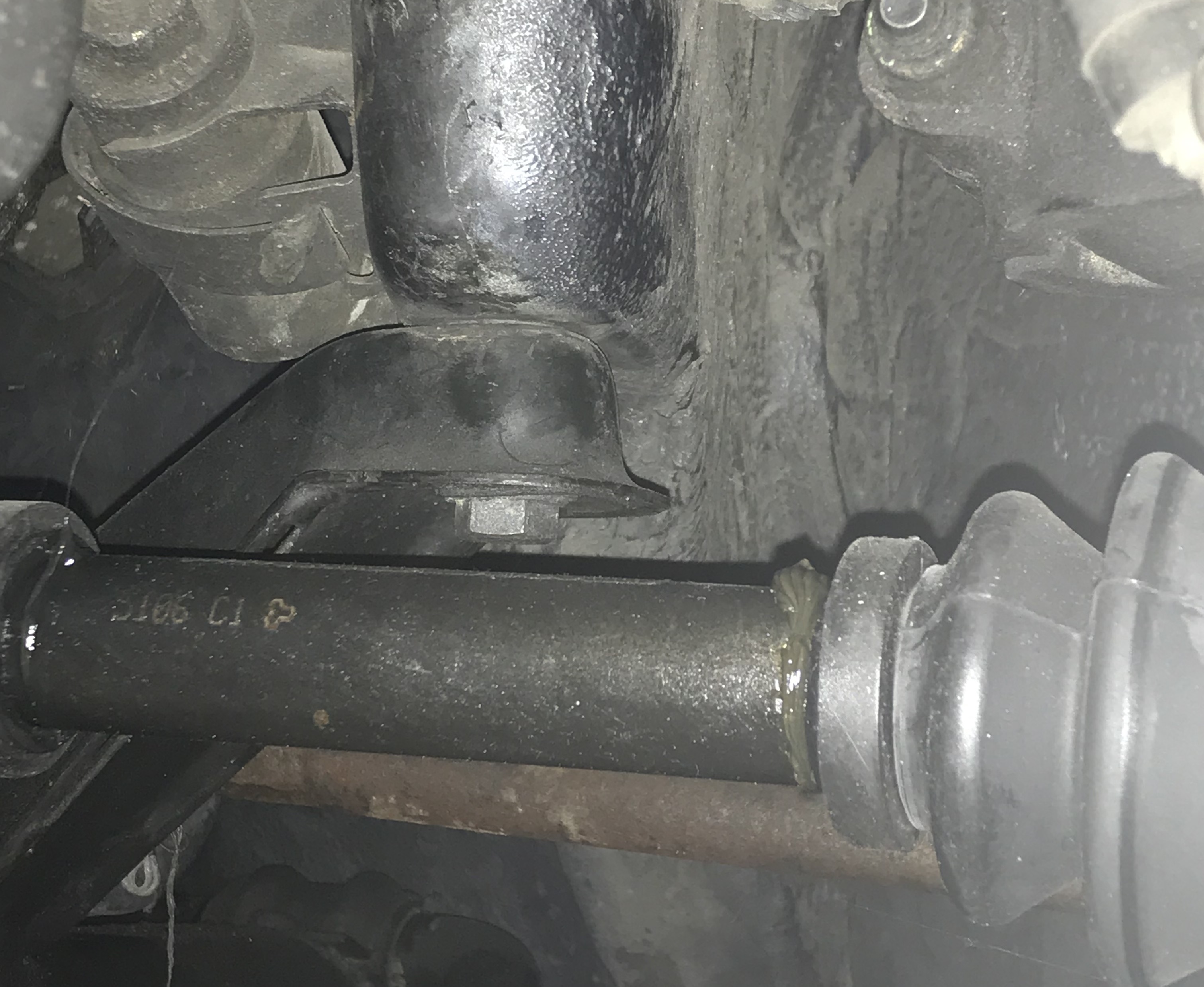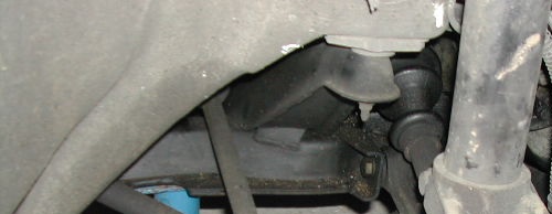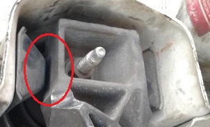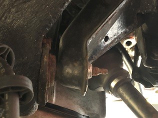 Les axes de fixations des silentblocs AR sont composés de deux goujons distincts non traversant. Le train est donc uniquement tenu, en partie AR, par le caoutchouc souple qui, s'il se déchire, n'assurera plus la fixation. Exemple de silentbloc AR détérioré → |