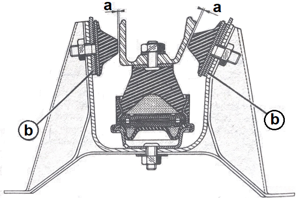 éliminant le jeu entre le support moteur droit et les silentblocs triangulaires en plaçant des cales d’épaisseur, voir Prép'Kits/kit n°6. Les cales (b) se placent sur le goujon de fixation des silentblocs pour les rapprocher du support moteur. Bien que la préconisation constructeur de la cote (a) est de 1mm il est recommandé d'avoir un jeu (a) nul ou en légère contrainte afin d'immobiliser correctement et au maximum le moteur. |