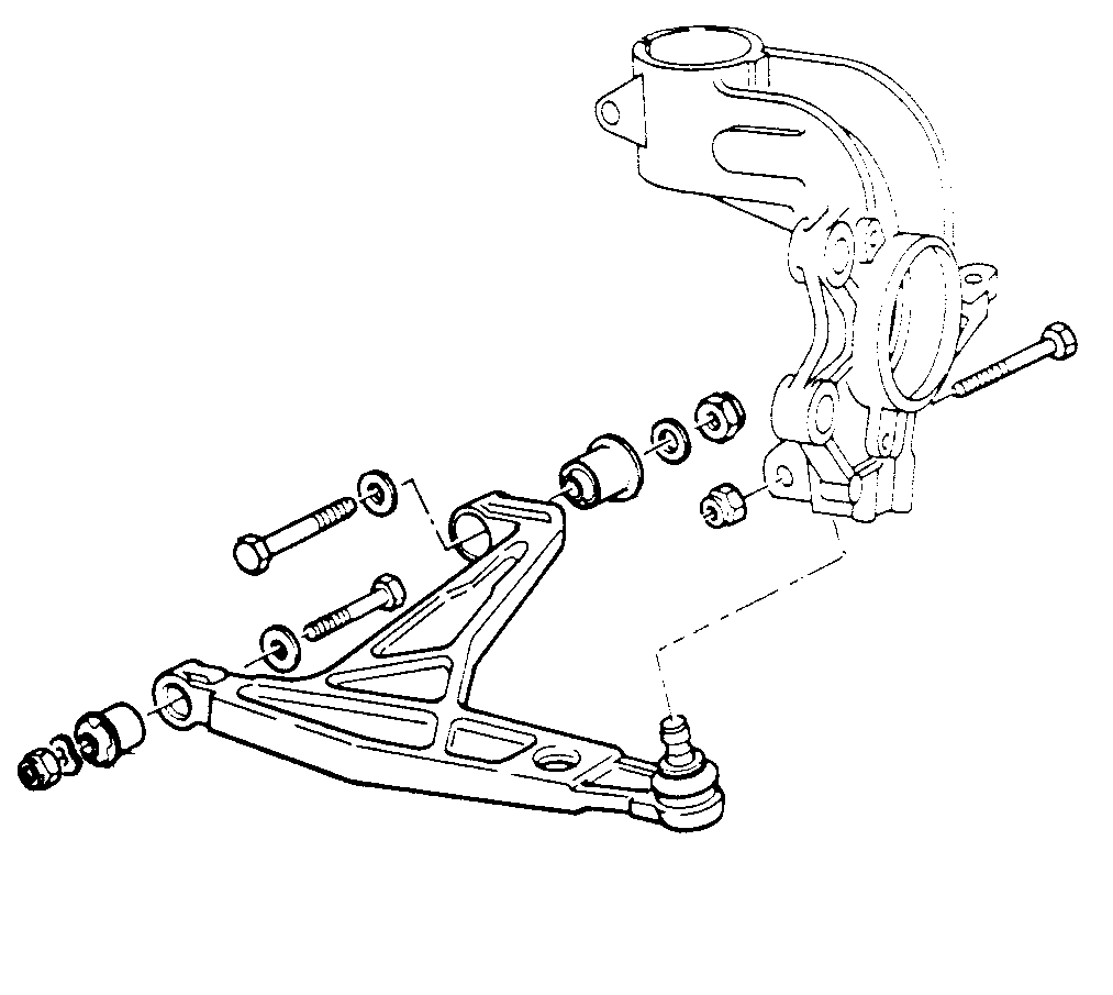 Pour cette liaison, les silentblocs sont intégrés à l’éléments (bras ou triangle). Ils peuvent être remplacés mais il est plus judicieux de changer les bras, ou triangles, afin de bénéficier de rotules de suspension neuves.
