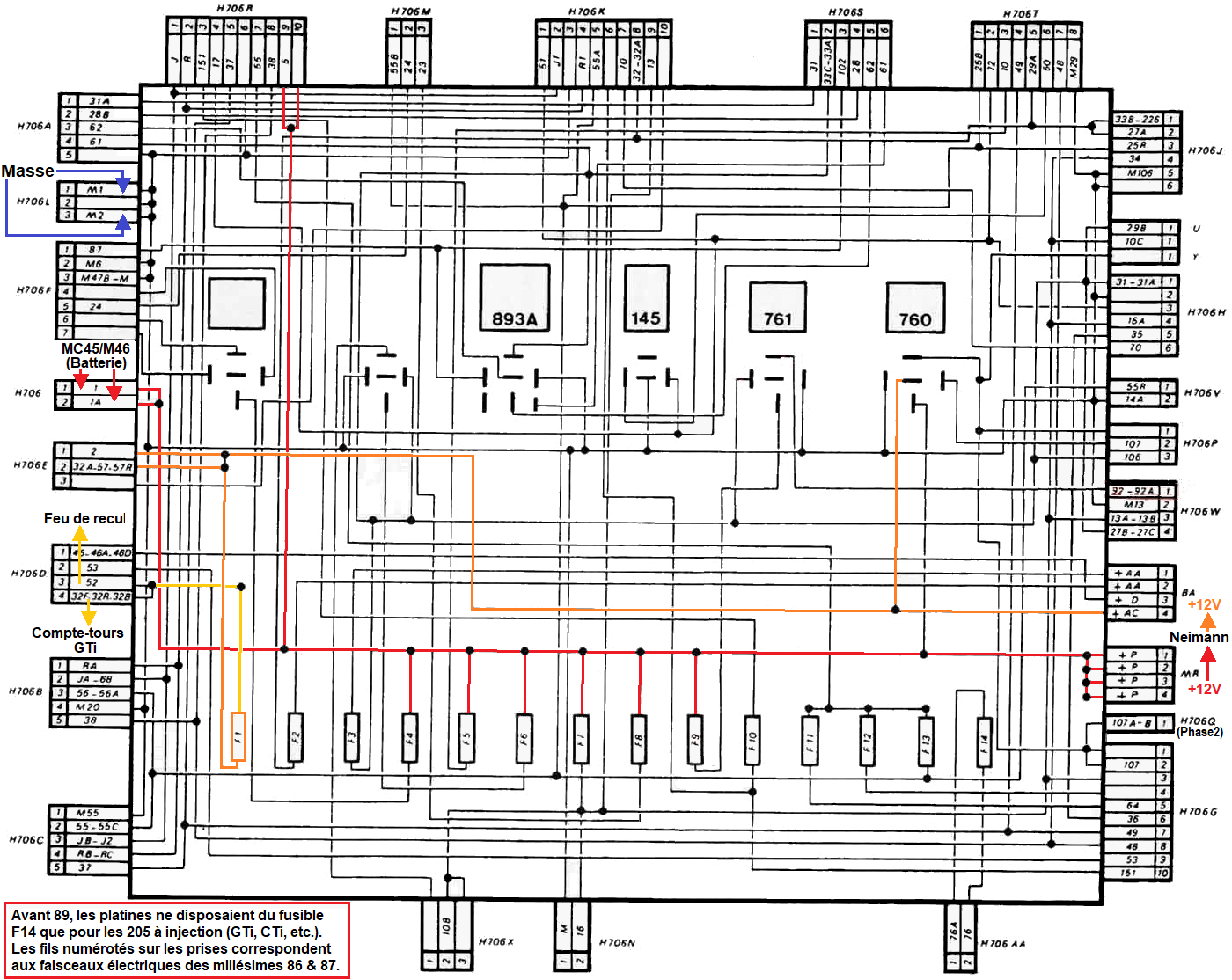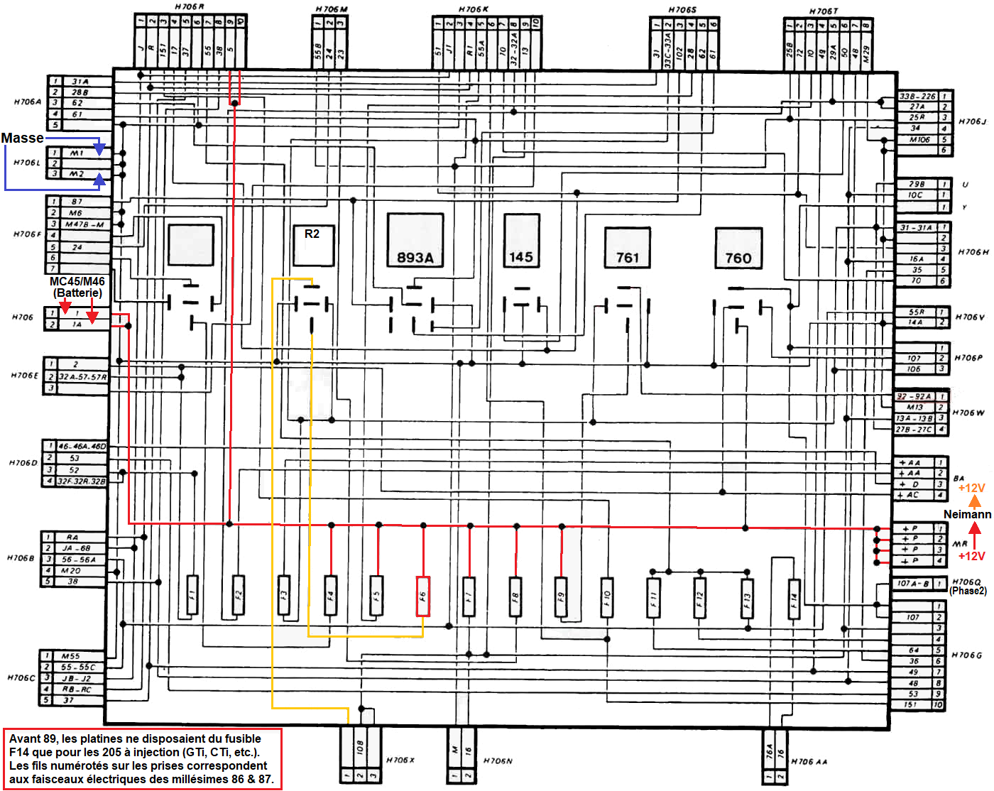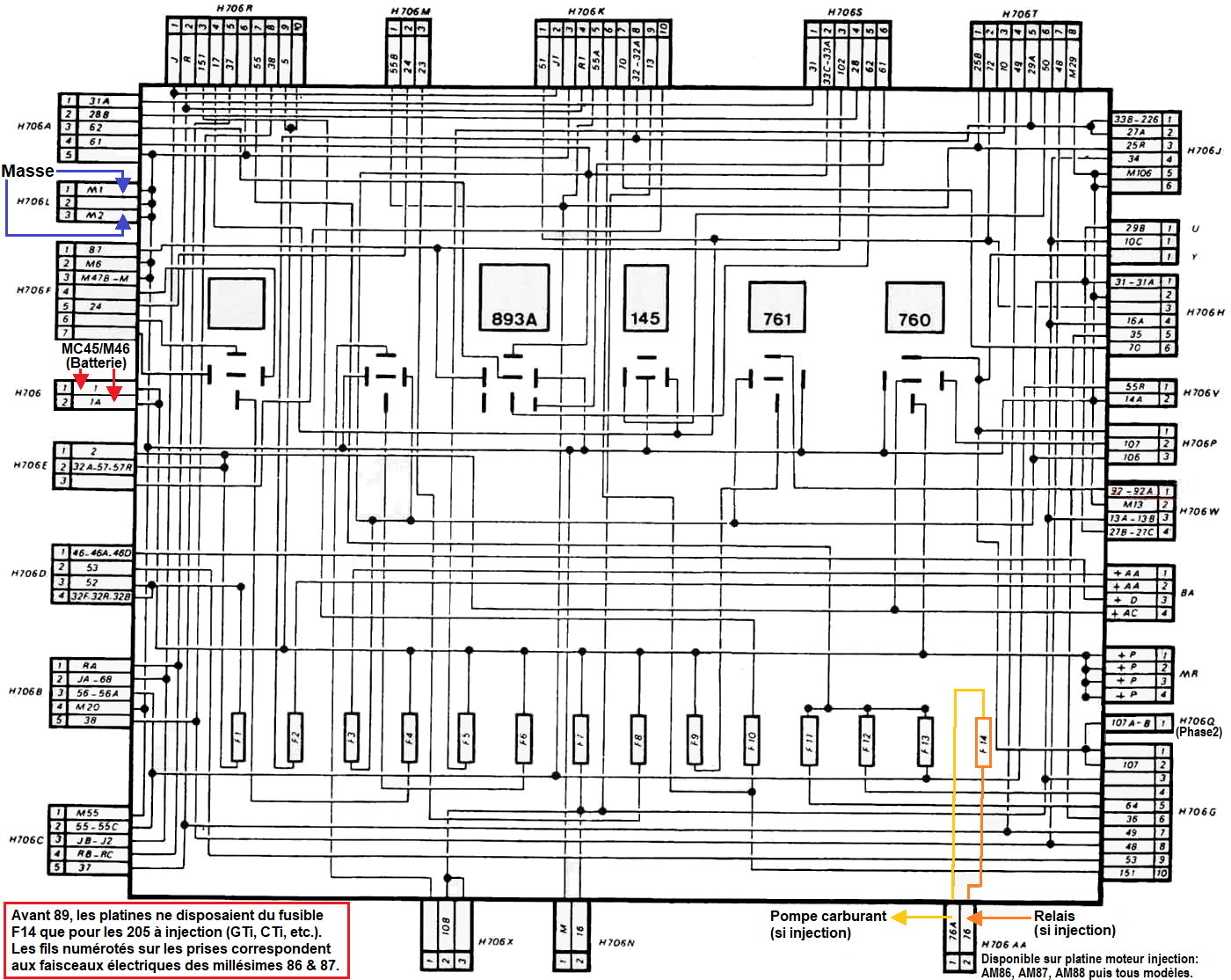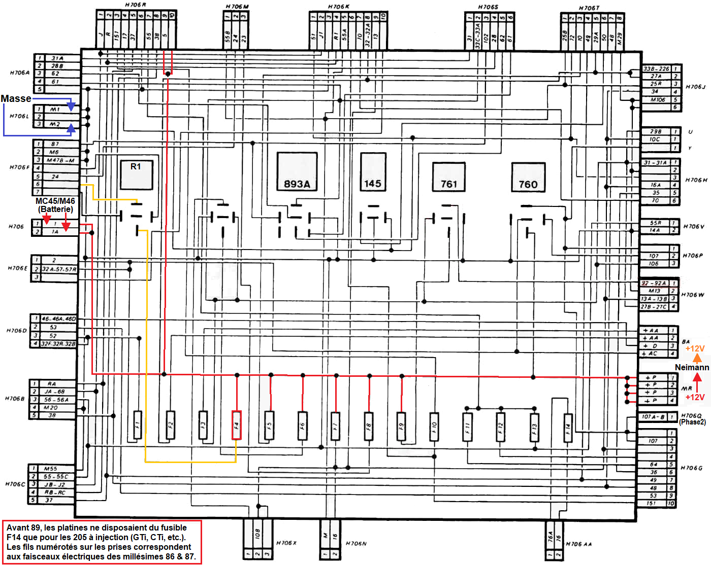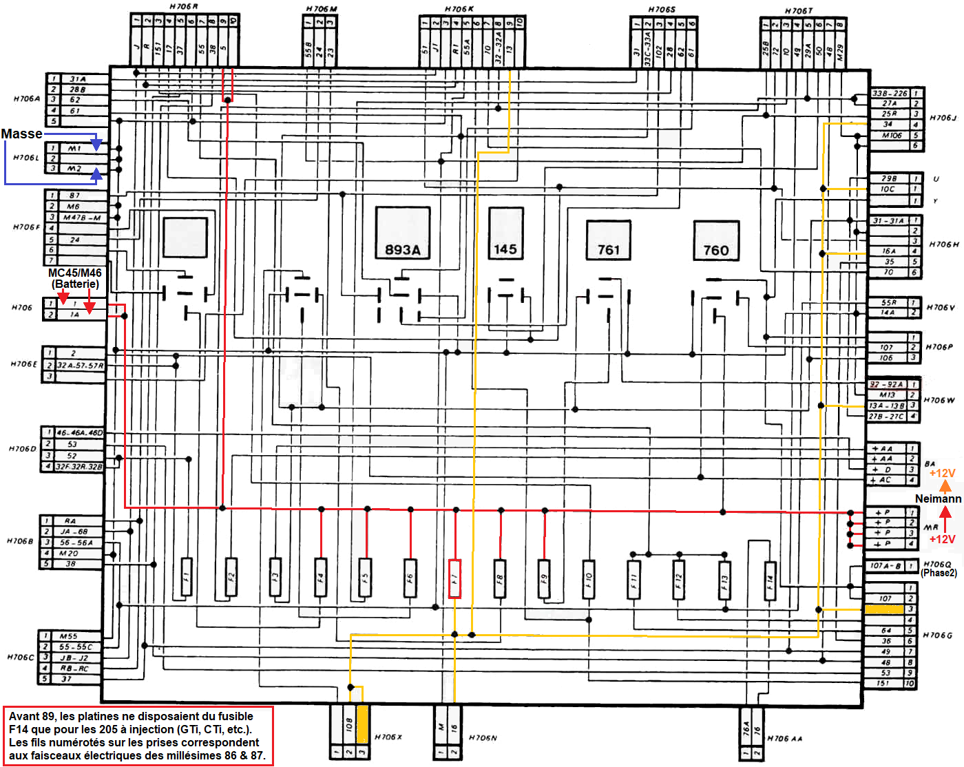 | Schéma interne boitier lié au fusible: | F1 | F2 | F3 | F4 | F5 | F6 | F7 | F8 | F9 | F10 | F11 | F12 | F13 | F14 |