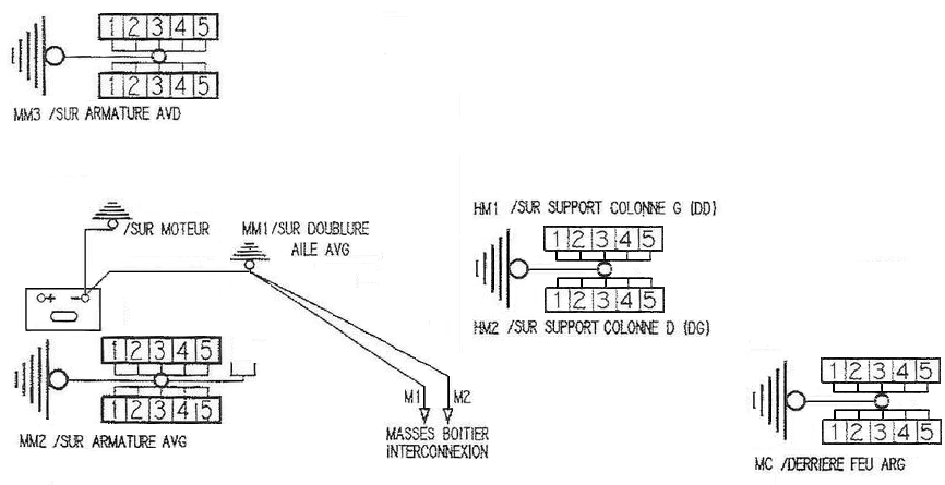 Les points de masse, composés de bornier à prise, sont disposés sur plusieurs endroits dont certains (MM2 & MM3) sont soumis à la corrosion.