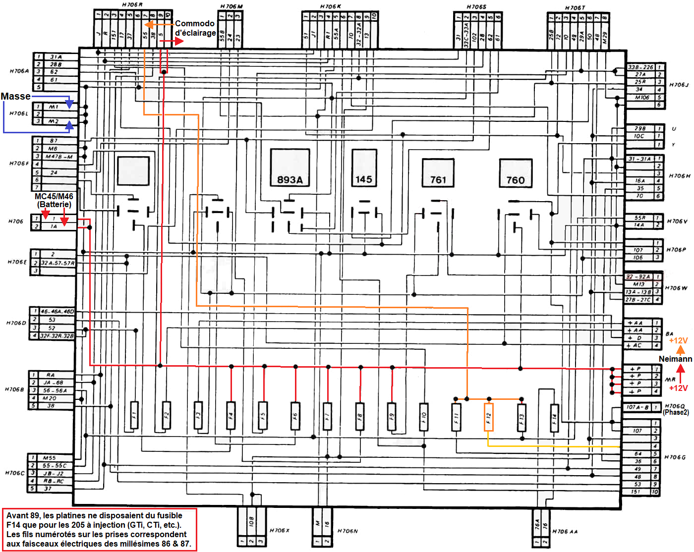 Notes : Le fusible F5 ne possède qu'une seule sortie sur le boitier interconnexions qui est utilisées pour les feux de détresse (warning). Les fusibles F4 et F6 disposent d'un relais leur donnant un rôle +12V accessoire mais ne possèdent qu'une seule sortie sur le boitier interconnexions. Le fusible F7 possède plusieurs sorties sur le boitier interconnexions qui ne sont pas tous utilisées. Le fusible F8 peut être utilisé par l'interrupteur de chauffage glace AR (si cette fonction est supprimée) grâce au relais R4. Les fusibles F10 à F13 ne sont que des alimentations provenant des commandes d'éclairage ne pouvant être utilisés pour un circuit autre qu'éclairage. Le fusible F14 ne possède pas d'alimentation électrique interne au boitier interconnexions. |