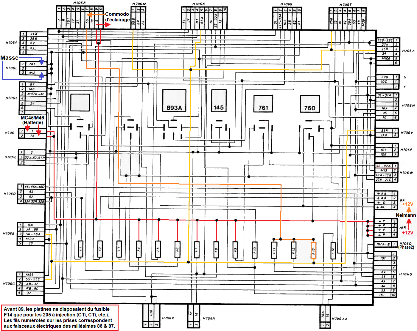 Il existe deux types de platine porte fusibles d'habitacle dépendant du millésime de la 205. • Avant 86 : 12 fusibles • A partir de 86 : 14 fusibles La première version de platine en 12 fusibles n'est pas indiquée dans cette rubrique. |