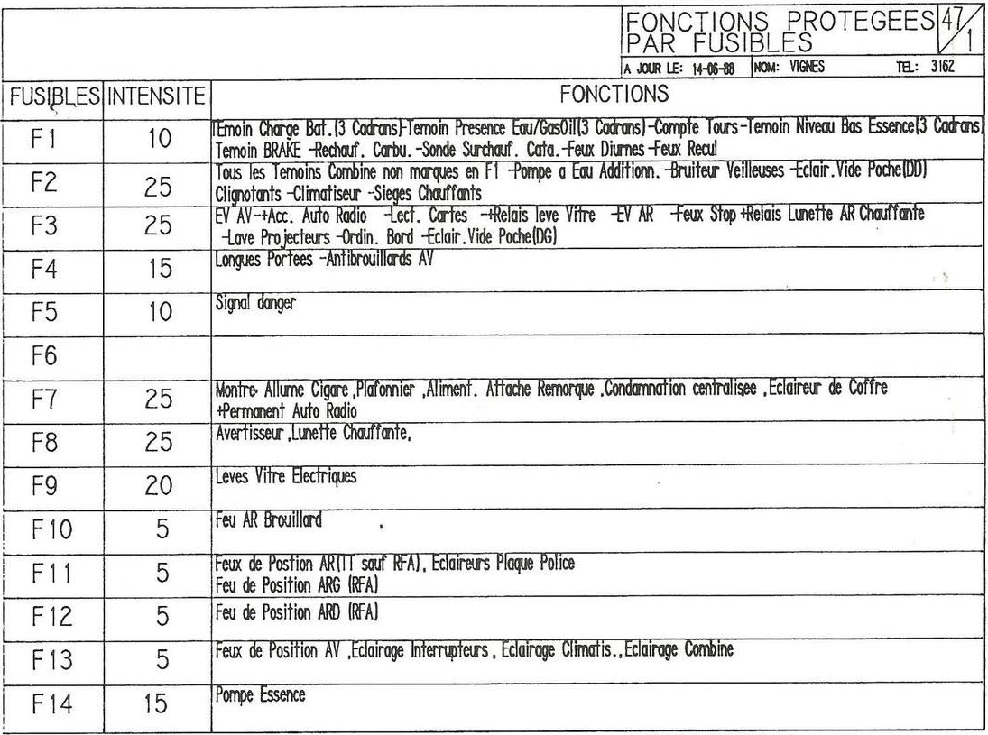 | F7 | + Permanent (2)* | 25A | Montre (+F3 ou F1 si quartz) + Plafonnier + Attache remorque + Éclairage coffre + Condamnation centralisée + 12V permanent Autoradio + suivant version : AM86 AM89 AM91 |