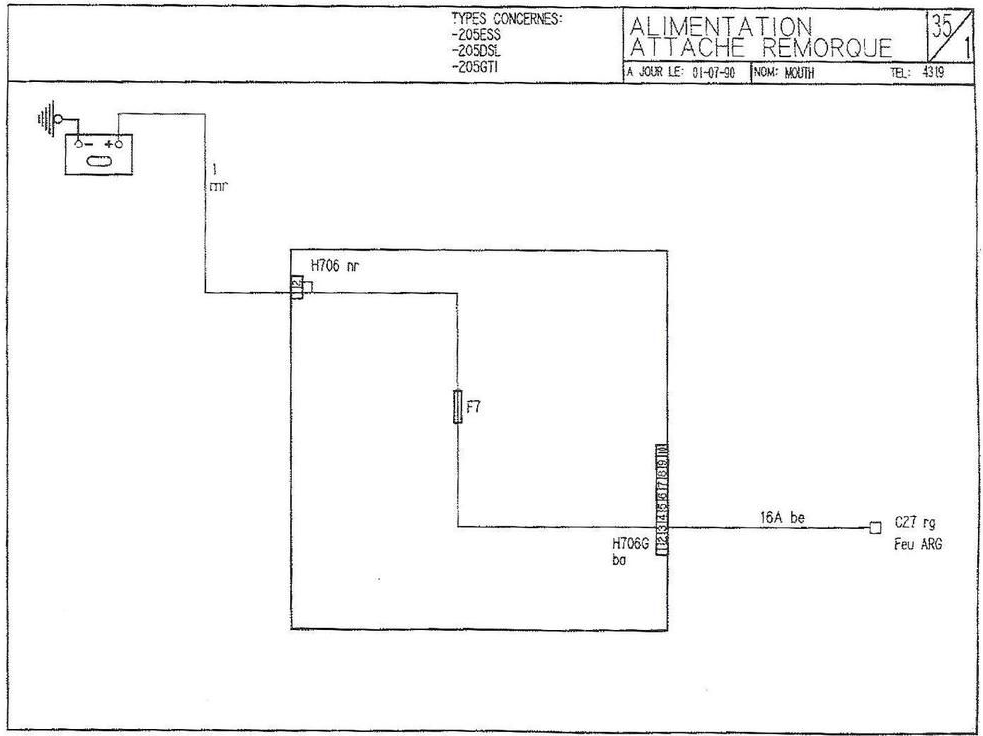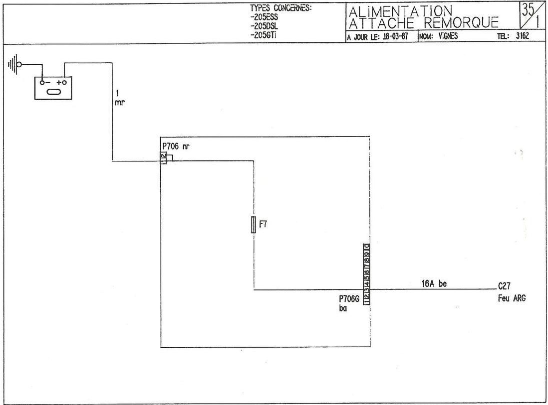 • Attache remorque (Fusible F7 - Sortie borne 3 de la prise 706G du boitier interconnexions ←12V permanent.