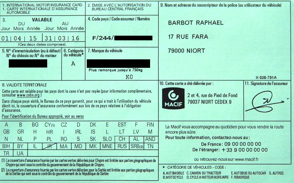 La validité territoriale est indiquée sur votre carte verte (lettres d'identification par pays). Si le pays que vous allez visiter est barré, demandez à votre compagnie d'assurance un avenant à votre contrat d'assurance auto. Vous obtiendrez ainsi les garanties nécessaires pour vous couvrir durant la période de votre séjour. Avant votre départ à l'étranger, pensez aussi aux pays que vous allez traverser avant de rejoindre le pays de destination : ils peuvent être rayés de la carte verte. Si c'est le cas, demandez à votre assureur une assurance spécifique.