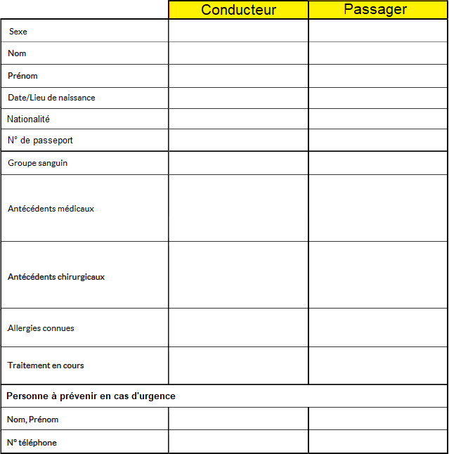 Si vous partez avec une organisation, une fiche médicale est souvent fournie que vous devez completer afin que l'organisateur du raid puisse collecter vos données personnelles lui donnant plus de réactivité.