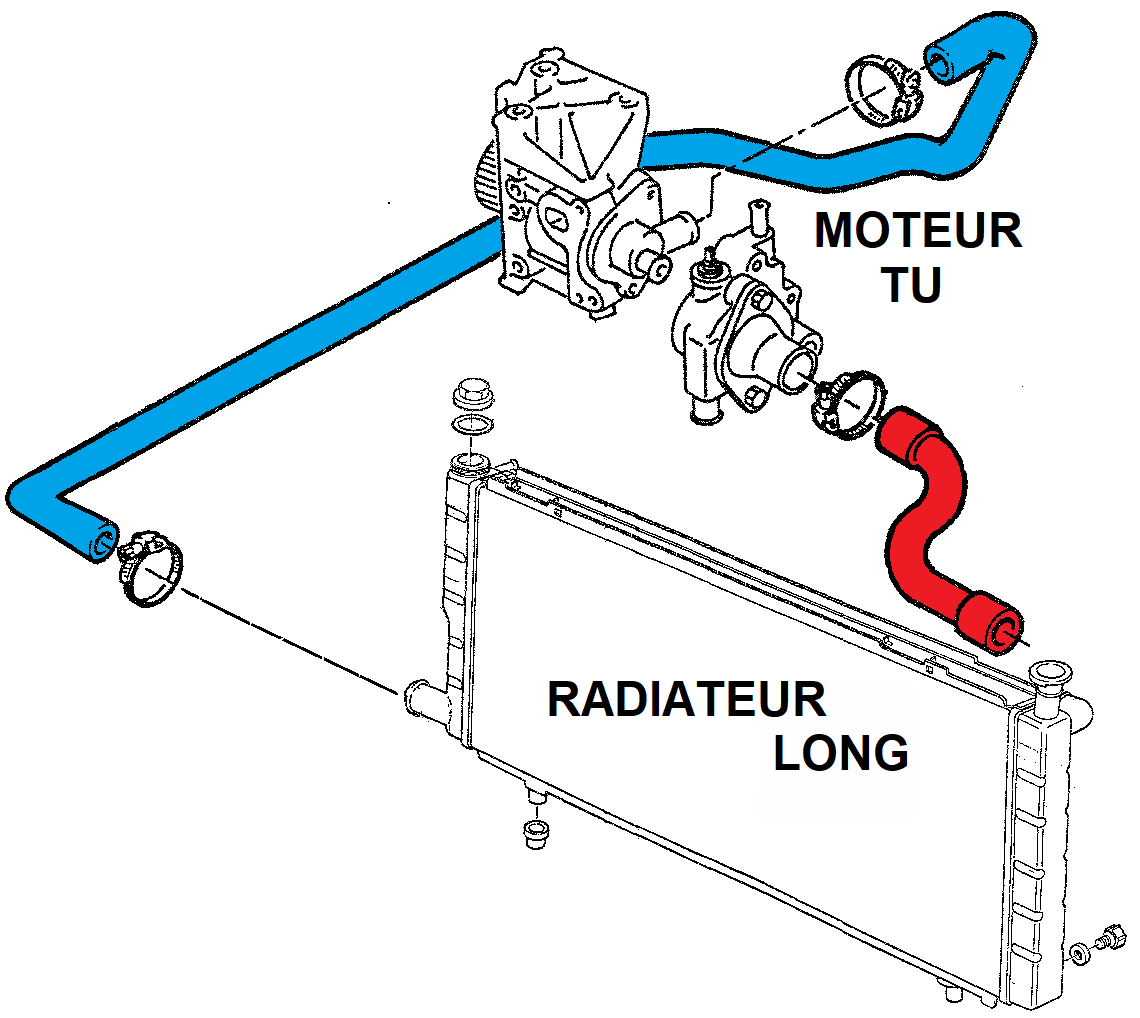| Ces durites se montent sur tous les moteurs TU équipés d'un radiateur large type XU & XUD (sauf entrée de radiateur pour moteur TU avec Modine). | |