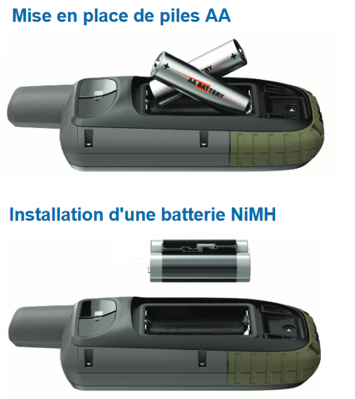 une batterie NimH, pouvant être rechargées par le port micro-USB en roulant. Les modèles GPSMAP 66sr et 66i ne sont pas compatibles avec des piles. L'alimentation se fait exclusivement par batterie lithium-ion ou par le port micro-USB.