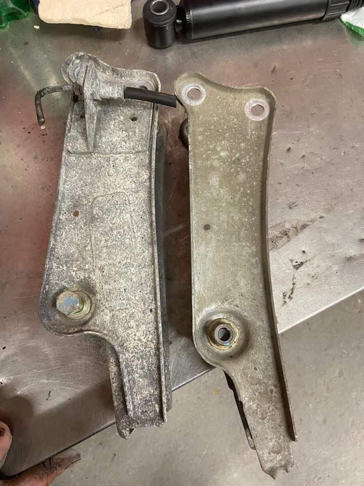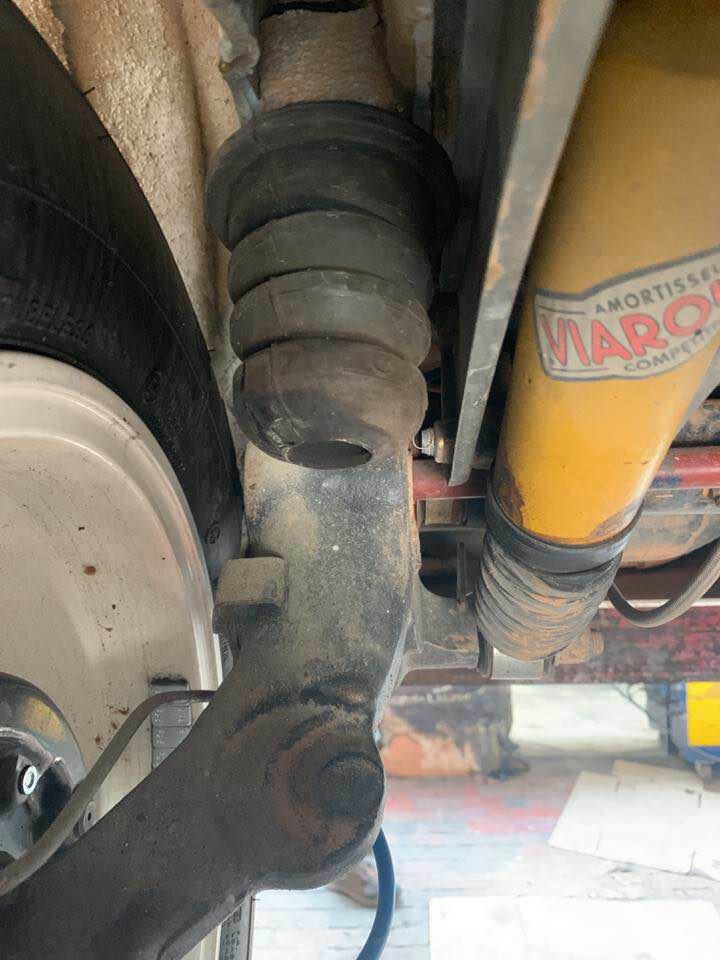 Attention, si le train est d'origine, la rehausse de la caisse au maximum peut engendrer une interférence entre le corps d'amortisseur et les fixations inférieures de traverse du fait de la cinématique de mouvement du bras de suspension.