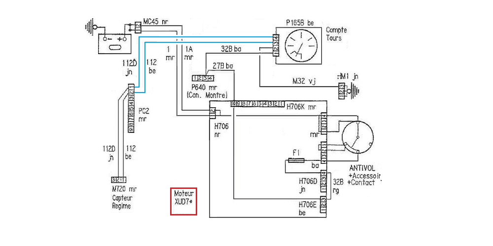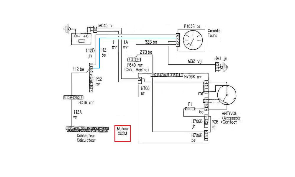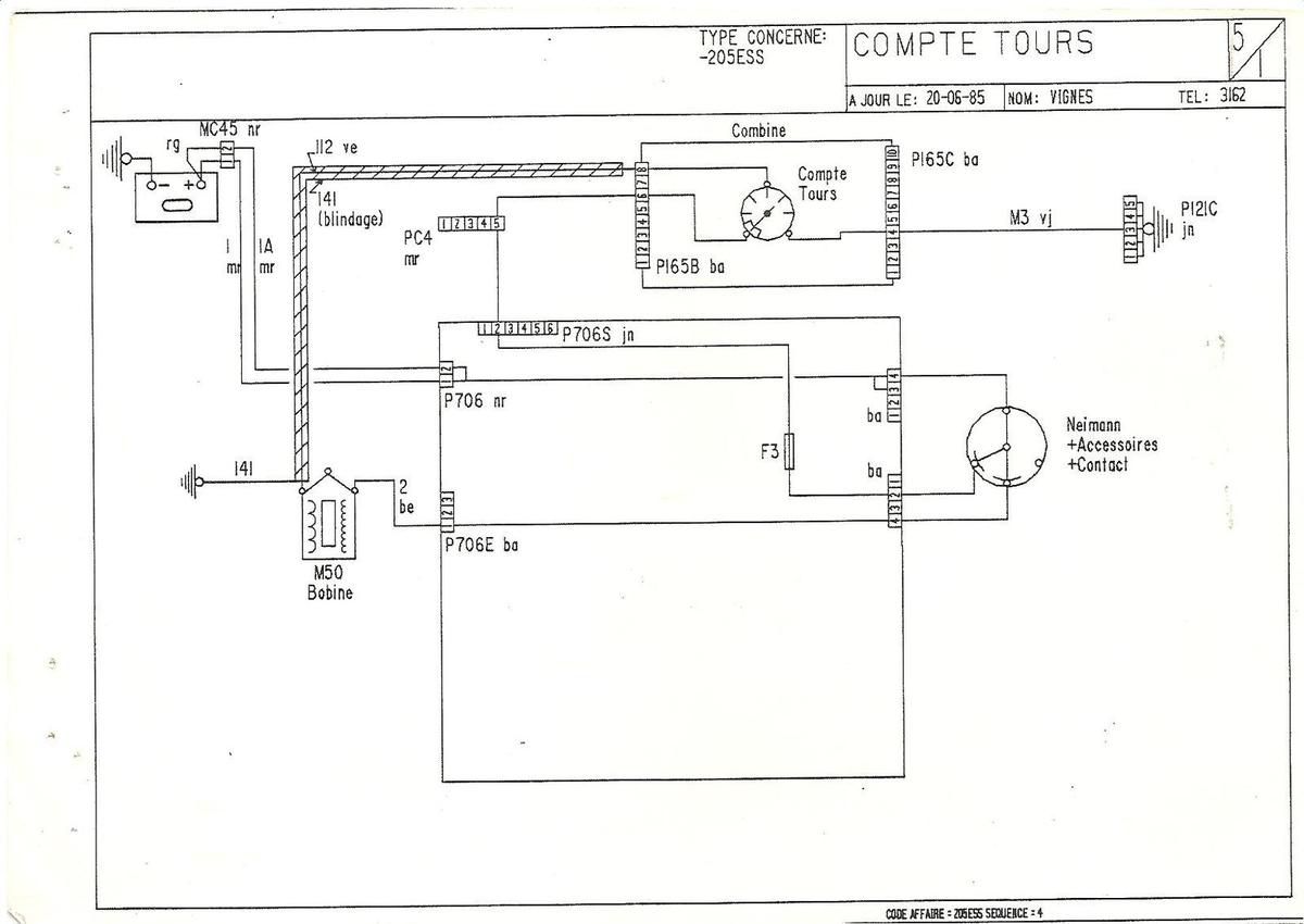 A noter que les 205 phase 1 (avant 88) pouvait être équipé d'un compteur "classique" Jeager avec un compte tours. Le fil 112 d'allumage se branche sur la borne 8 de la prise P165B blanche : |