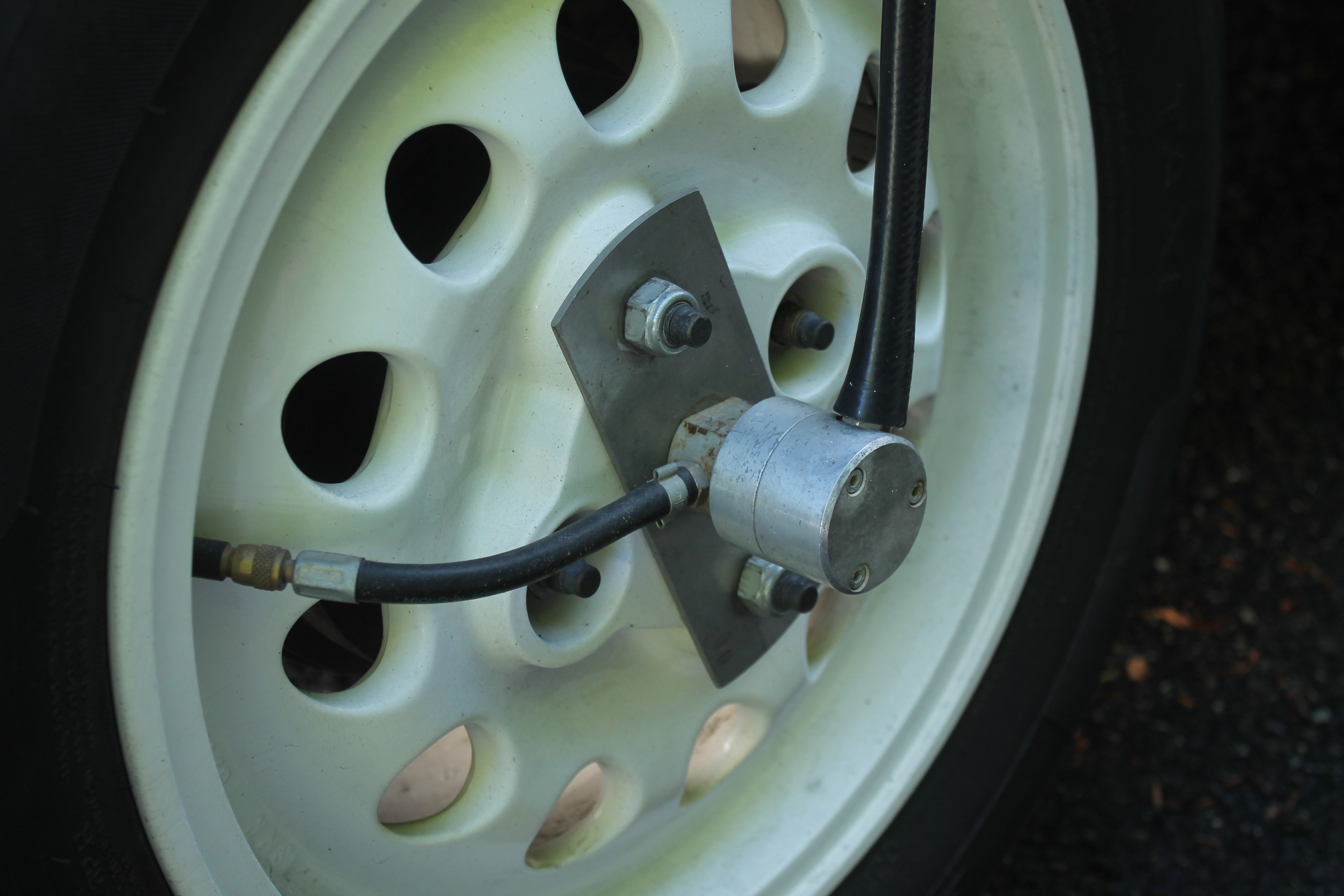Si la 205 n'est pas équipée d'un gonfleur/dégonfleur embarqué (télégonflage), un petit compresseur est suffisant pour gonfler les pneus l'un après l'autre.