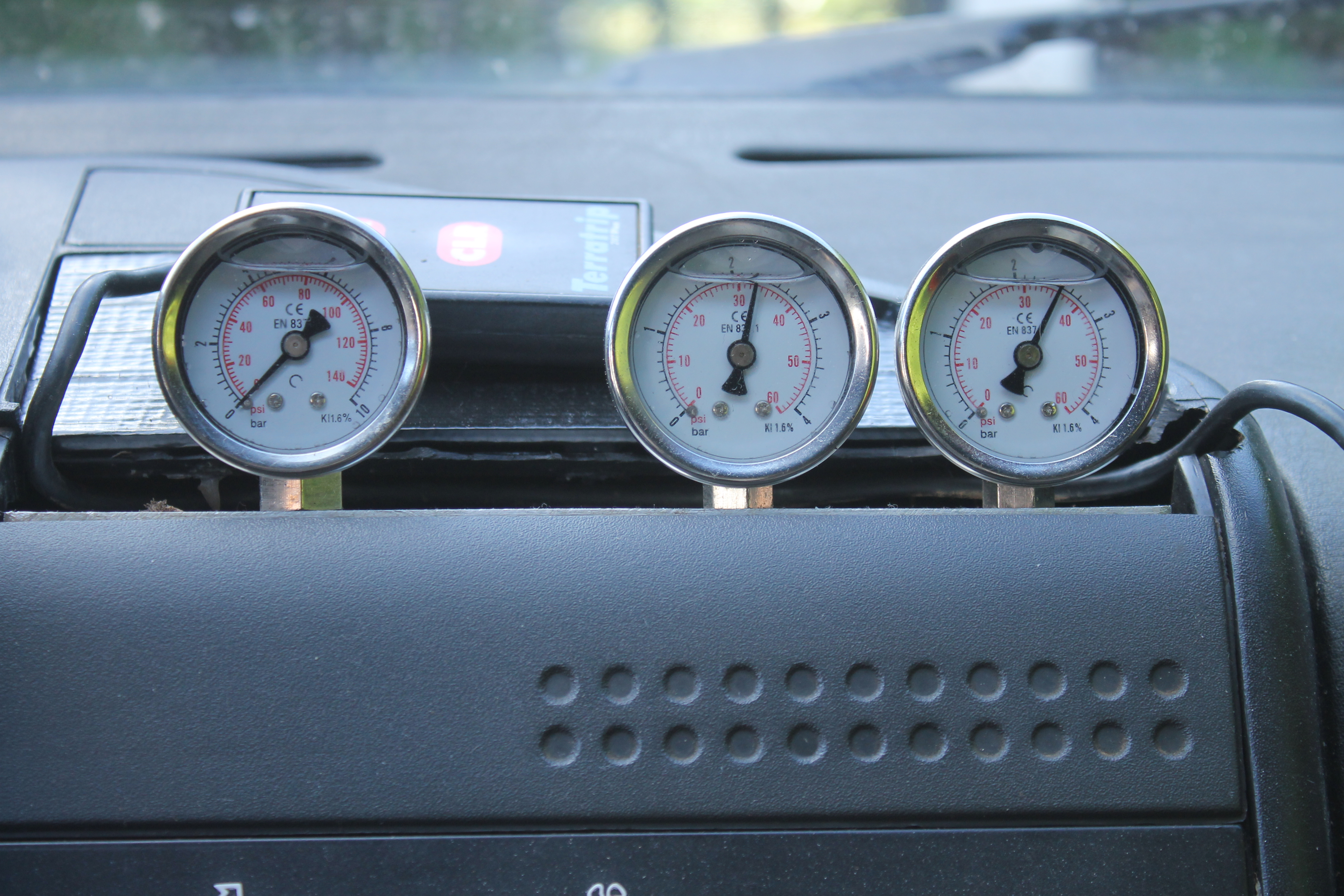 Des manomètres de 4bars pour les roues, et 10bars pour la réserve, apportent de la lisibilité (aiguilles centrées à pression "normale" d'utilisation).