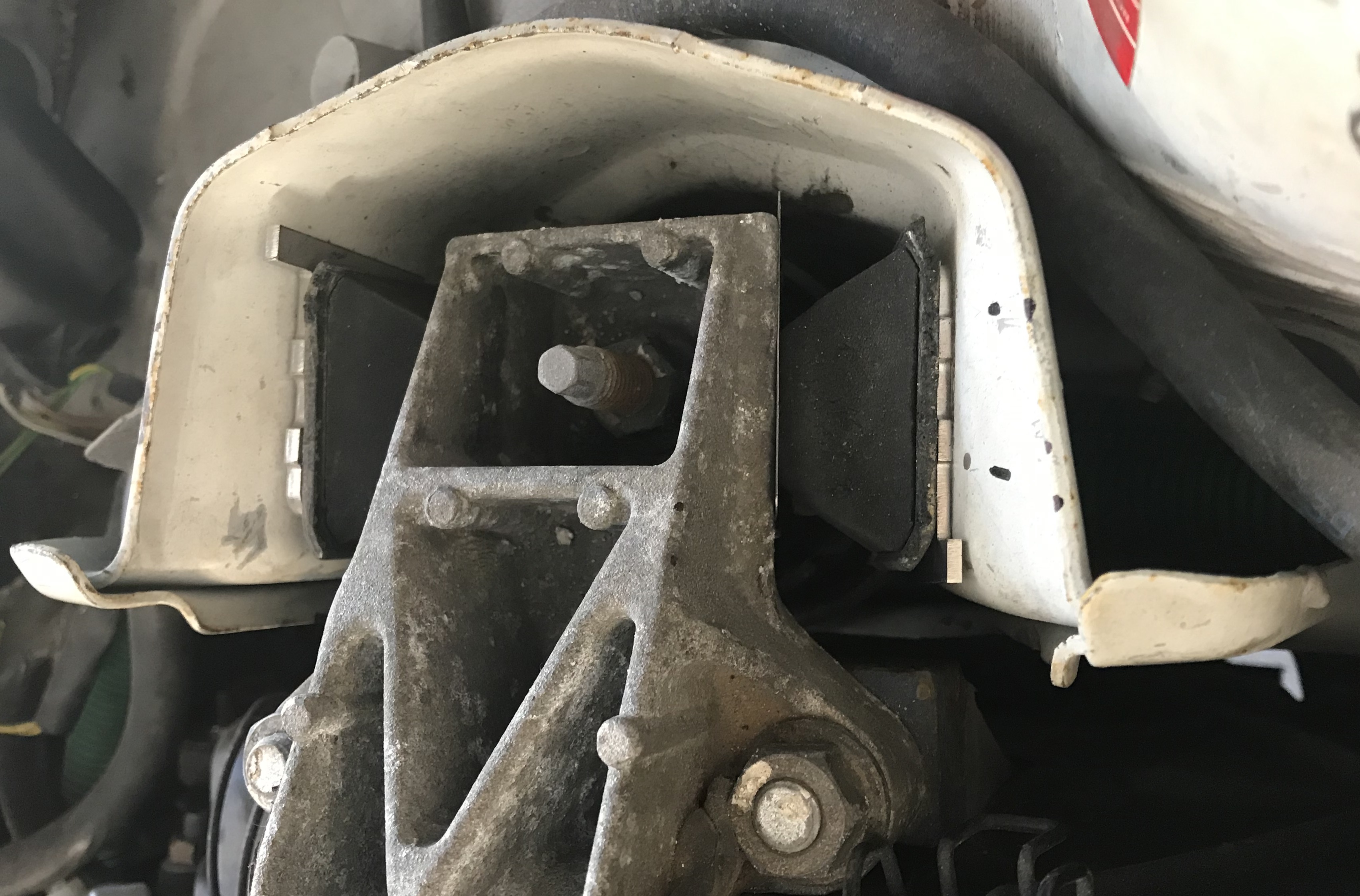 Les axes de fixations des silentblocs AR sont composés de deux goujons distincts non traversant. Le train est donc uniquement tenu, en partie AR, par le caoutchouc souple qui, s'il se déchire, n'assurera plus la fixation. Exemple de silentbloc AR détérioré → |