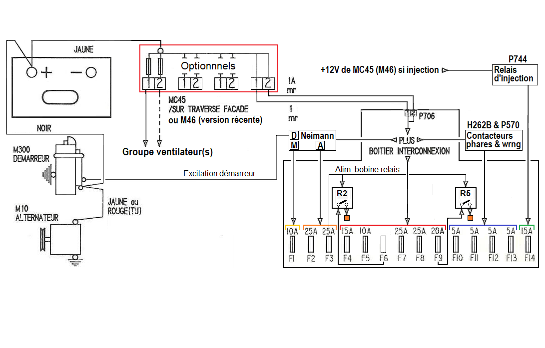 Il est possible d'utiliser le relais en position 2 du boitier interconnexions simplement par le rajout du fusible F6 mais il ne peut pas être contôlé par un interrupteur. Ce relais de circuit de puissance est commandé par le fusible F3 est donc permet d'avoir un +12V accessoire (même principe que le relais R5). Entrée de puissance : Fusible F6 venant de + 12V batterie. Sortie de puissance : Borne 1 de 706X. +12V accessoire : Venant du Neimann sur boitier interconnexions borne 2. Commande bobine de R2 : Interne au boitier interconnexions. Masse bobine de R2 : Interne au boitier interconnexions.