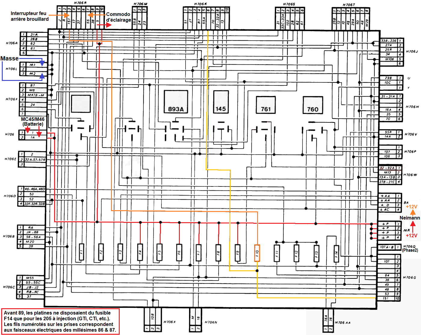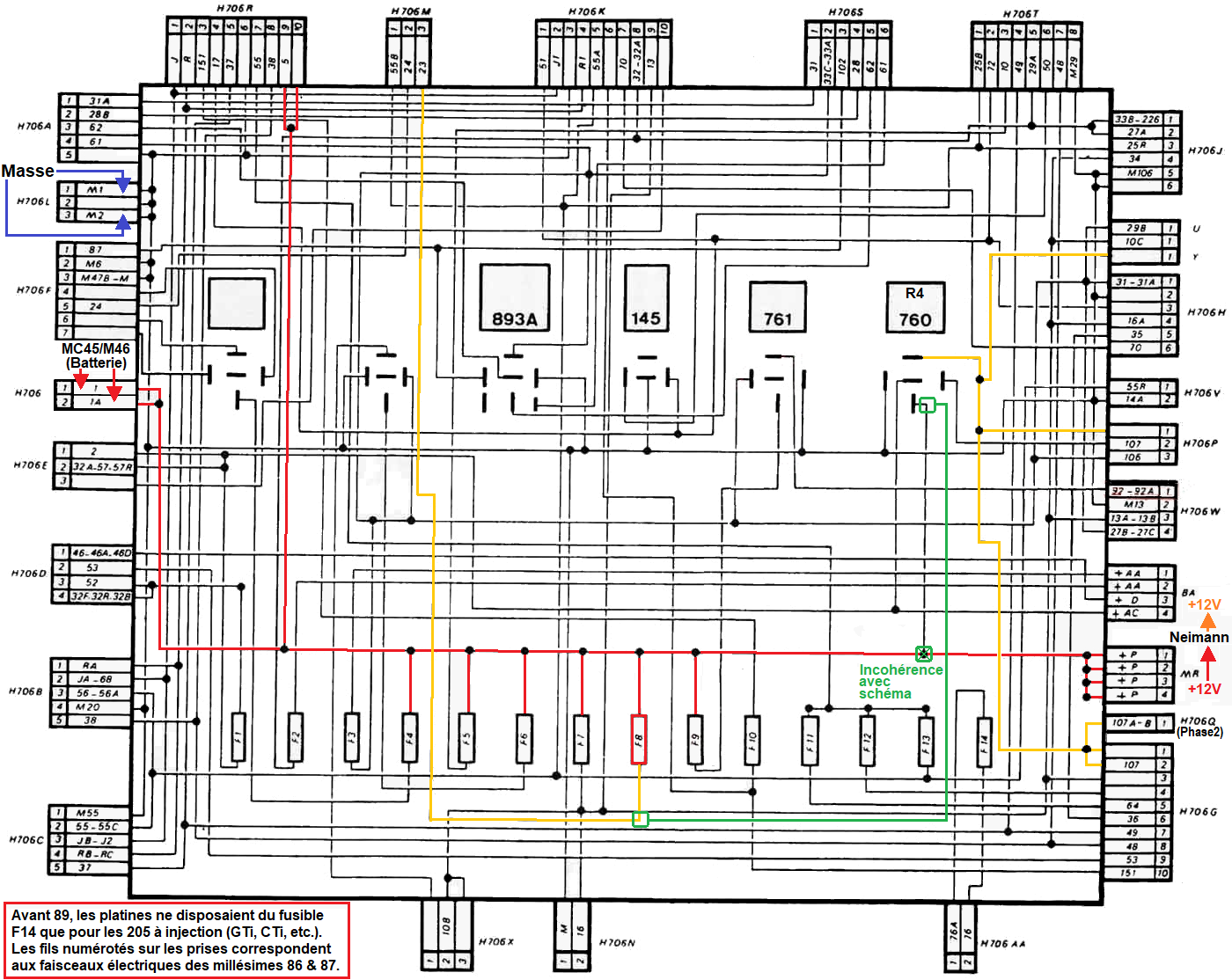 | Schéma interne boitier lié au fusible: | F1 | F2 | F3 | F4 | F5 | F6 | F7 | F8 | F9 | F10 | F11 | F12 | F13 | F14 |
