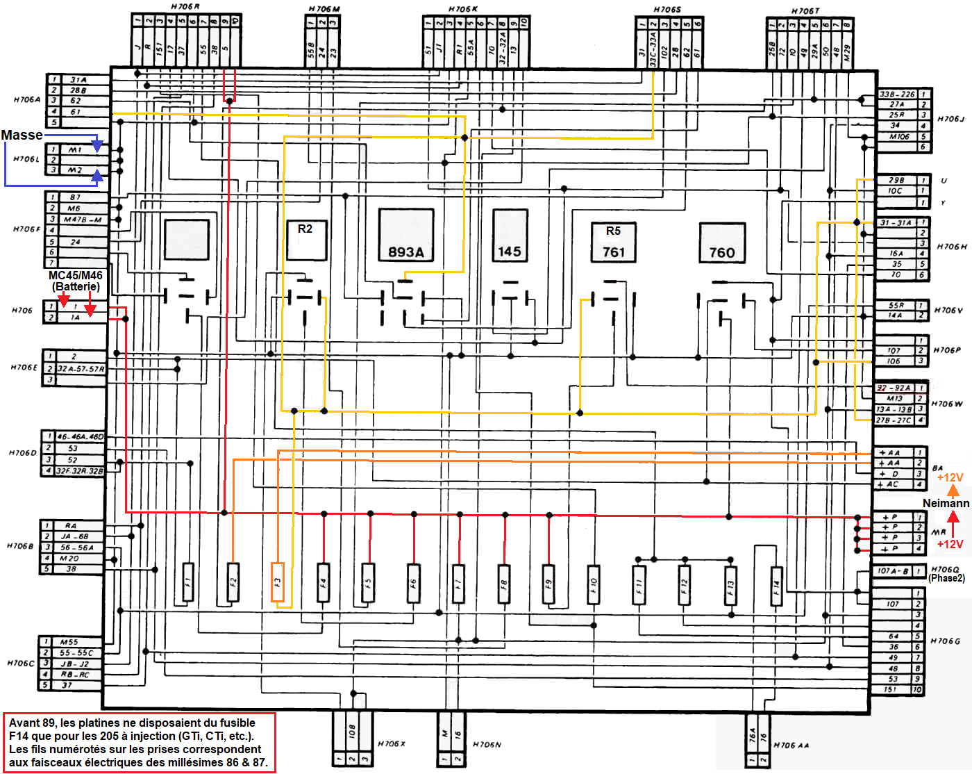 Il existe deux types de platine porte fusibles d'habitacle dépendant du millésime de la 205. • Avant 86 : 12 fusibles • A partir de 86 : 14 fusibles La première version de platine en 12 fusibles n'est pas indiquée dans cette rubrique. |