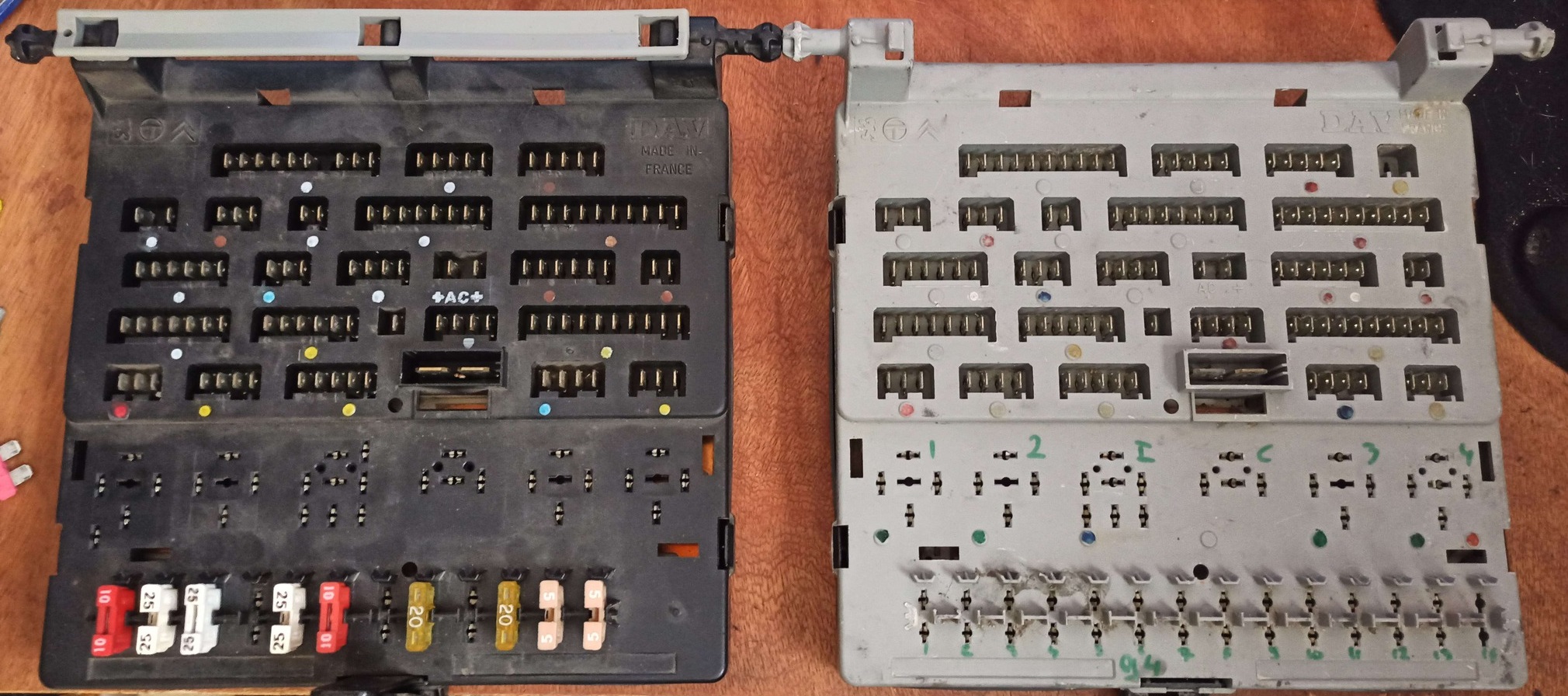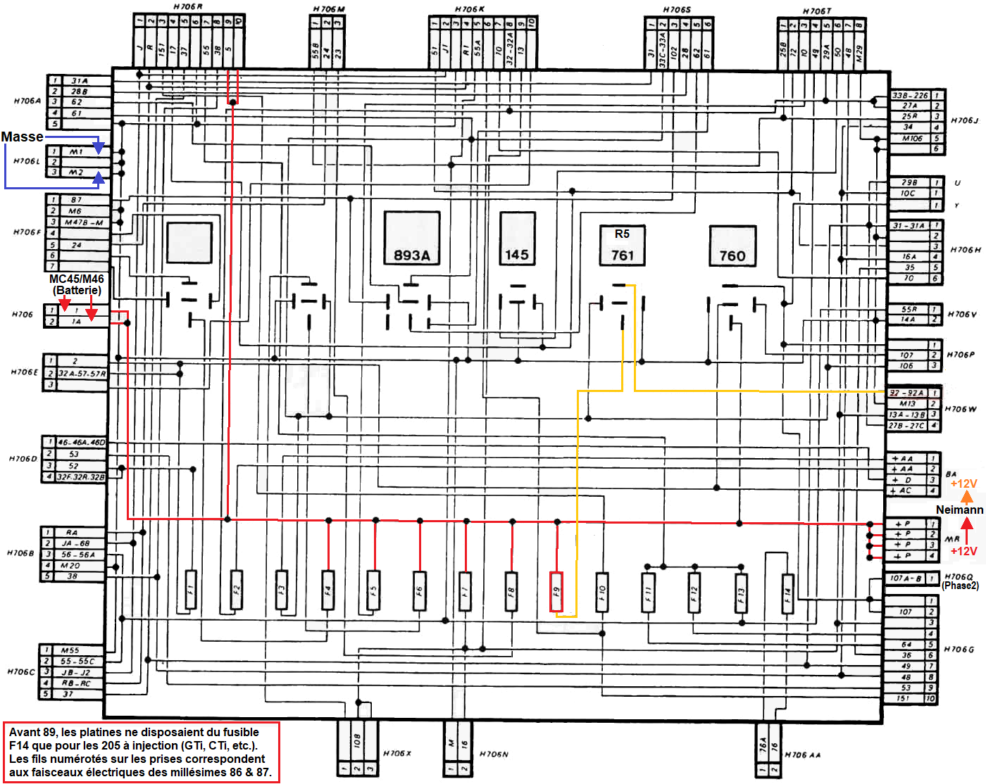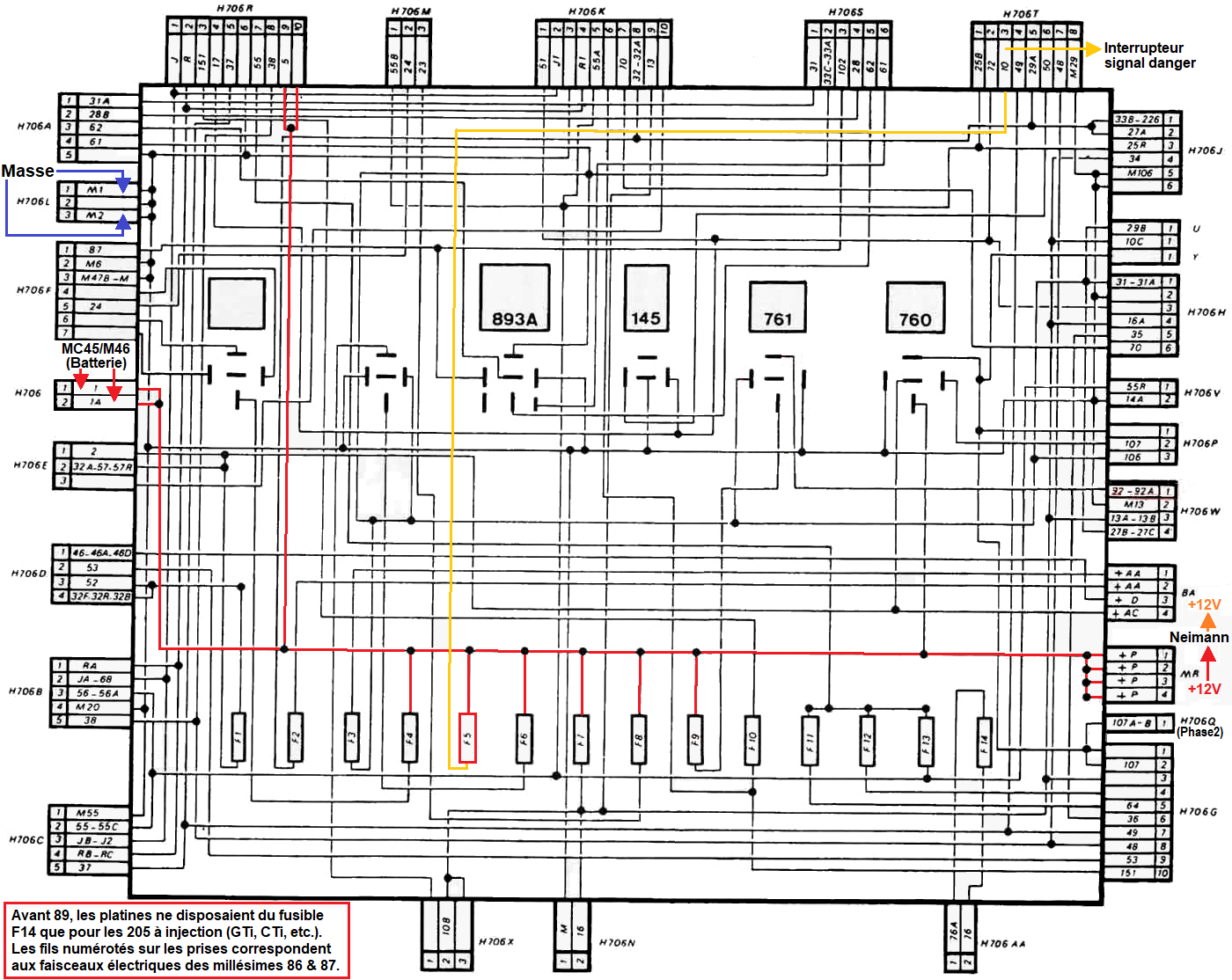 Notes : Le fusible F5 ne possède qu'une seule sortie sur le boitier interconnexions qui est utilisées pour les feux de détresse (warning). Les fusibles F4 et F6 disposent d'un relais leur donnant un rôle +12V accessoire mais ne possèdent qu'une seule sortie sur le boitier interconnexions. Le fusible F7 possède plusieurs sorties sur le boitier interconnexions qui ne sont pas tous utilisées. Le fusible F8 peut être utilisé par l'interrupteur de chauffage glace AR (si cette fonction est supprimée) grâce au relais R4. Les fusibles F10 à F13 ne sont que des alimentations provenant des commandes d'éclairage ne pouvant être utilisés pour un circuit autre qu'éclairage. Le fusible F14 ne possède pas d'alimentation électrique interne au boitier interconnexions. |