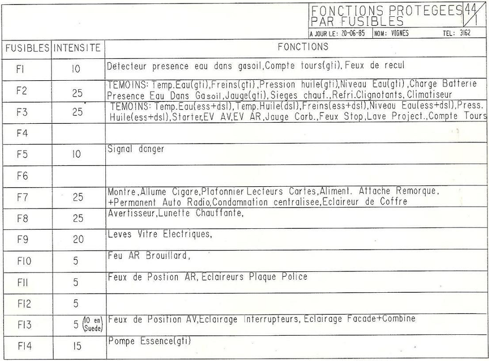 | F1 | + Contact (1)* | 10A | Feu de recul + Compte-tours de GTi + suivant version : AM86 AM89 AM91 |