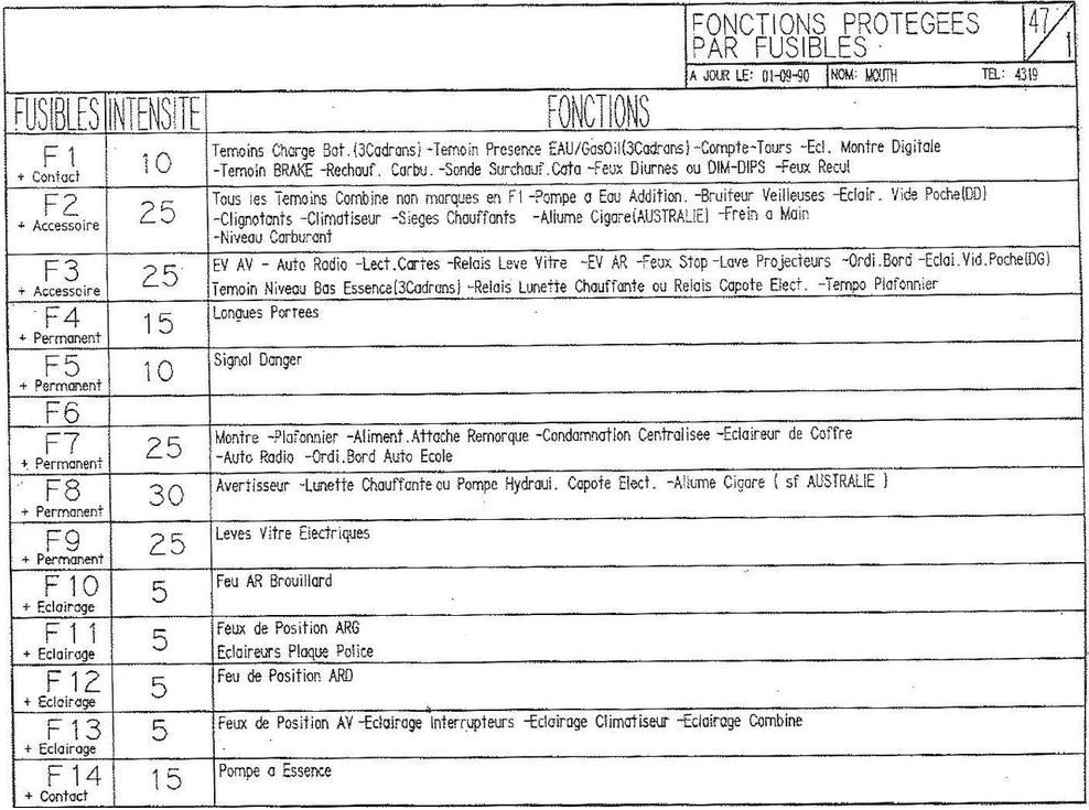 | F7 | + Permanent (2)* | 25A | Montre (+F3 ou F1 si quartz) + Plafonnier + Attache remorque + Éclairage coffre + Condamnation centralisée + 12V permanent Autoradio + suivant version : AM86 AM89 AM91 |