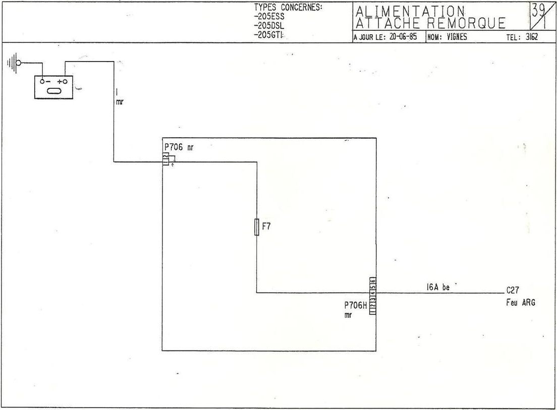 • Attache remorque (Fusible F7 - Sortie borne 3 de la prise 706G du boitier interconnexions ←12V permanent.