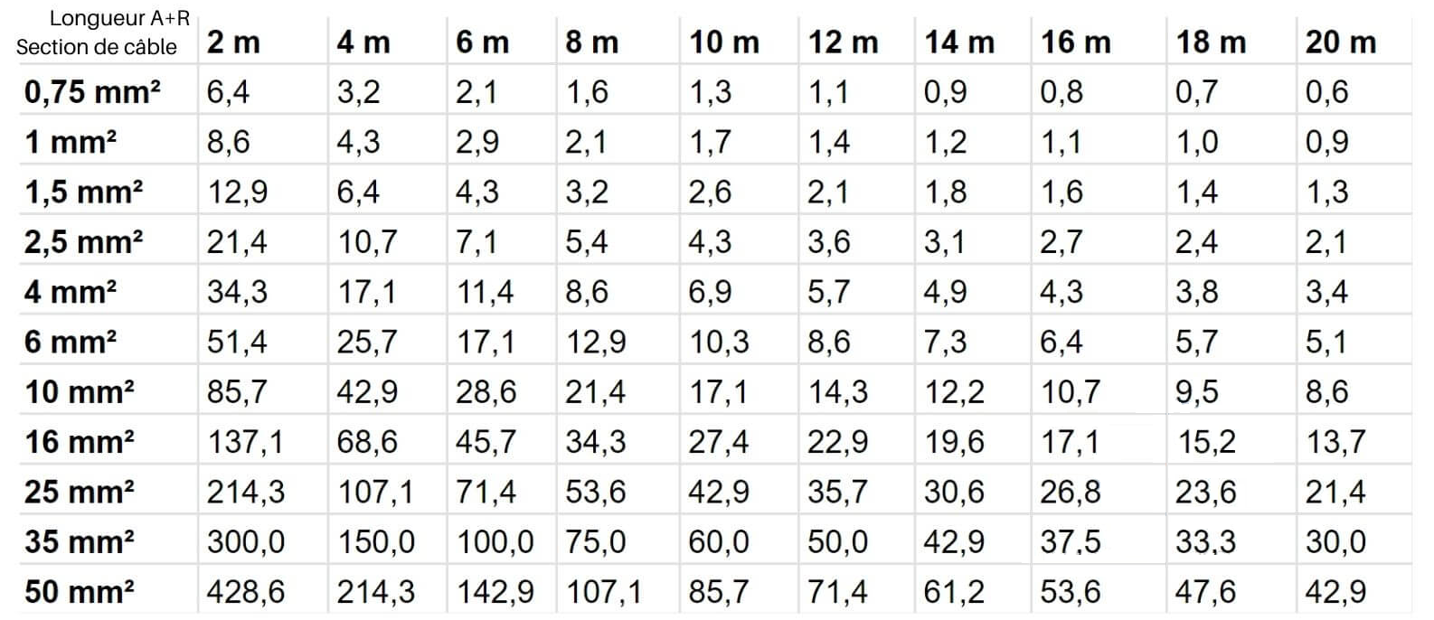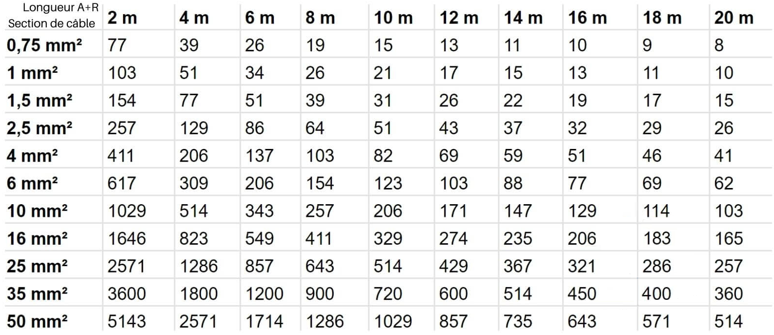 | Section câble 12v/Puissance Max | Section câble 12V/Intensité Max |